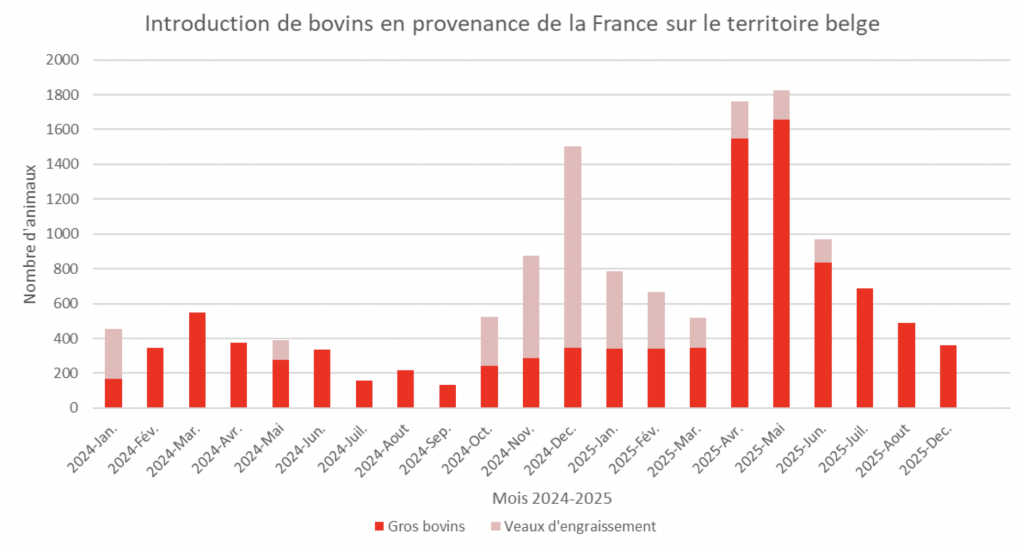 Die Verbringung von Rindern aus den Sperrgebieten (siehe unten) ist gemäß den europäischen Vorschriften selbstverständlich verboten. Das Risiko für Belgien besteht daher nicht in der Einfuhr von Rindern aus einem kontaminierten Gebiet, sondern vielmehr aus einem nicht regulierten Gebiet, in dem das Virus bereits vorhanden ist, aber noch nicht nachgewiesen wurde.