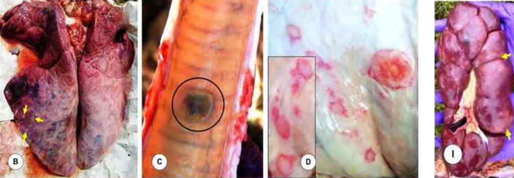 LSD – Läsionen innere Organe: Lunge (B), Luftröhre (C), Pansen (D), Nieren (I) - Quelle: Manjunathareddy G. et al., Vet. Quat., 2024 - https://pmc.ncbi.nlm.nih.gov/articles/PMC11378666/